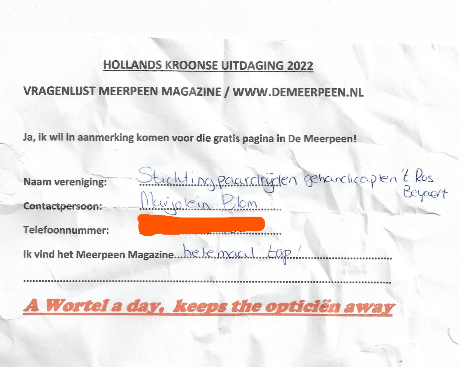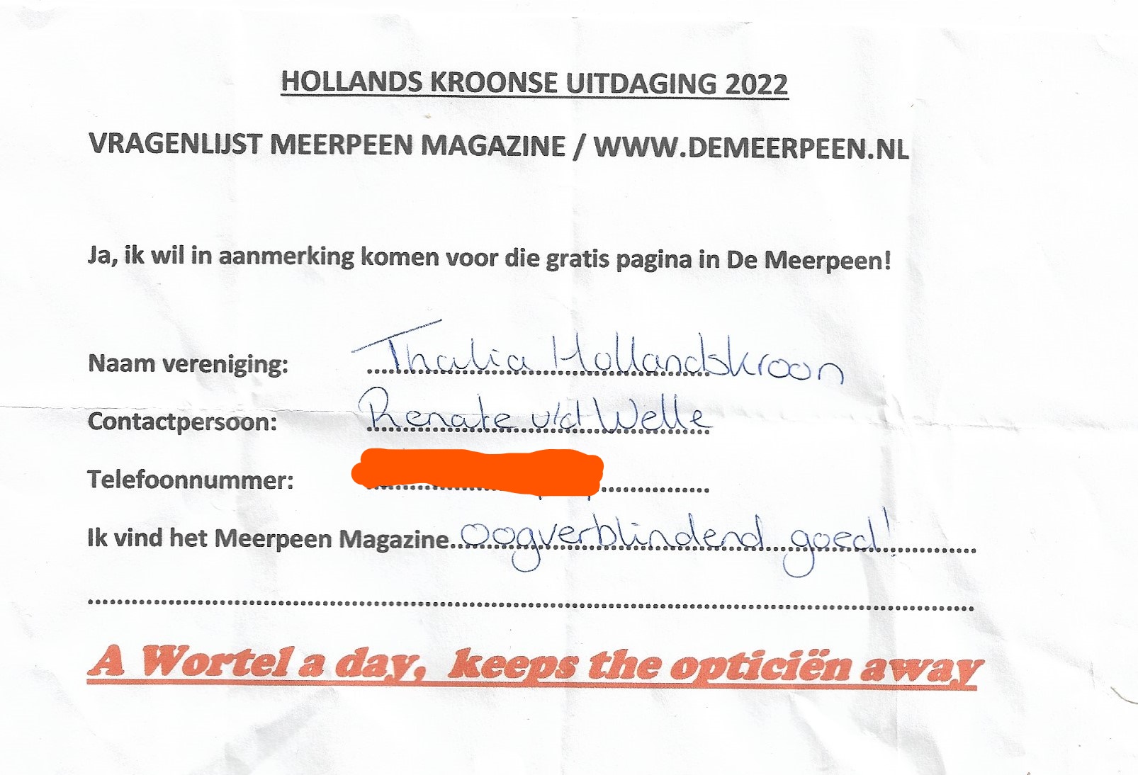 WIERINGERWERF – Tijdens de succesvolle Beursvloer Hollands Kroon gisteravond in RSG Wiringherlant heeft uitgeverij De Meerpeen met twee verenigingen een match gemaakt. Tijdens de Beurs konden alle aanwezige verenigingen en stichtingen hun deelnameformulier in de glazen pot deponeren. Te vergeven waren een gratis pagina redactie in het Meerpeen Magazine én een gratis artikelplaatsing op de nieuwssite www.demeerpeen.nl. Aan het eind van de Beurs heeft Uitdaging-voorzitter Edwin Wittink de twee “gelukkigen” geloot. Het gratis artikel op de site gaat naar Stichting Paardrijden gehandicapten ’t Ros Beyaert uit Sint Maarten en de hele pagina in het Meerpeen Magazine is gewonnen door Thalia Hollands Kroon. Vanuit de Meerpeen: gefeliciteerd met jullie prijs!