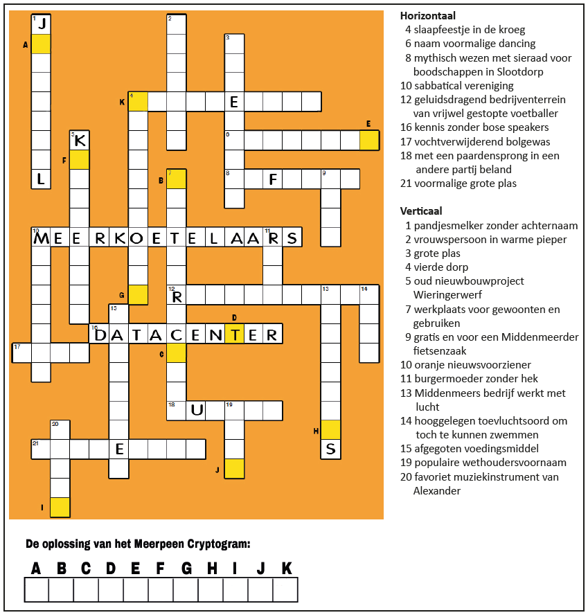 WIERINGERMEER – In het Meerpeen Magazine van februari stond deze keer een cryptogram. En gezien het aantal (goede) oplossingen bleek de puzzel voor velen best moeilijk. Daarom hebben we besloten om de puzzelaars die er niet uitkomen een klein beetje te helpen. In de afbeelding hieronder staan een paar woorden ingevuld en ook hebben we hier en daar wat letters prijsgegeven. Puzzelaars hebben nog tot maandagavond de tijd om de oplossing door te geven op onze website.