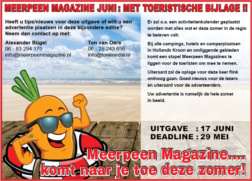 WIERINGERMEER – Rond 17 juni komt het eerstvolgende Meerpeen Magazine weer uit. Nummer 13 dit keer, voorwaar geen ongeluksgetal. Deze Glossy heeft in een relatief korte tijd goed geworteld in de Wieringermeer en erbuiten. De komende editie wordt een speciale. Naast de verwachte en onverwachte redactionele bijdrages dit keer met een joekel van een toeristisch/recreatieve bijlage. Het magazine wordt uiteraard weer huis-aan-huis in de héle Wieringermeer en bij de gebruikelijke afhaalplekken in de regio bezorgd. Deze editie wordt echter ook gedurende het héle zomerseizoen bij alle campings in Hollands Kroon, het Makadocentrum in Schagen en andere strategische (toeristische) plekken doorlopend neergelegd. De oplage gaat daarom van 5.500 naar 6.500 exemplaren!!! Extra interessant voor u als adverteerder. Uw advertentie wordt door nog meer mensen bekeken en blijft het hele zomerseizoen actueel!!!