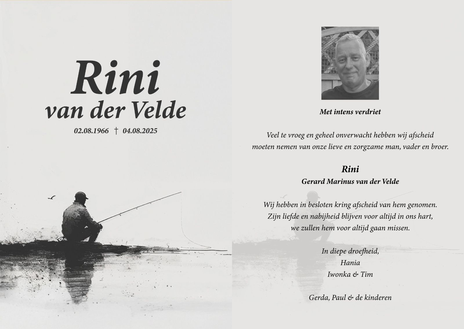 Home/Familieberichten/Overleden de heer Rini van der Velde FamilieberichtenLokaal nieuwsNieuws Overleden de heer Rini van der Velde De Meerpeen - Alexander Bügel28 augustus 2025 Dit delen:Tweet Klik om te delen op WhatsApp (Wordt in een nieuw venster geopend) WhatsApp Klik om dit te e-mailen naar een vriend (Wordt in een nieuw venster geopend) E-mail Klik om af te drukken (Wordt in een nieuw venster geopend) Print Tagsfamiliebericht familieberichten Gerard Marinus van der Velde Rini van der Velde De Meerpeen - Alexander Bügel28 augustus 2025 Laat meer zien Delen Facebook X LinkedIn Tumblr Pinterest Messenger Messenger WhatsApp Telegram Deel via de e-mail Print