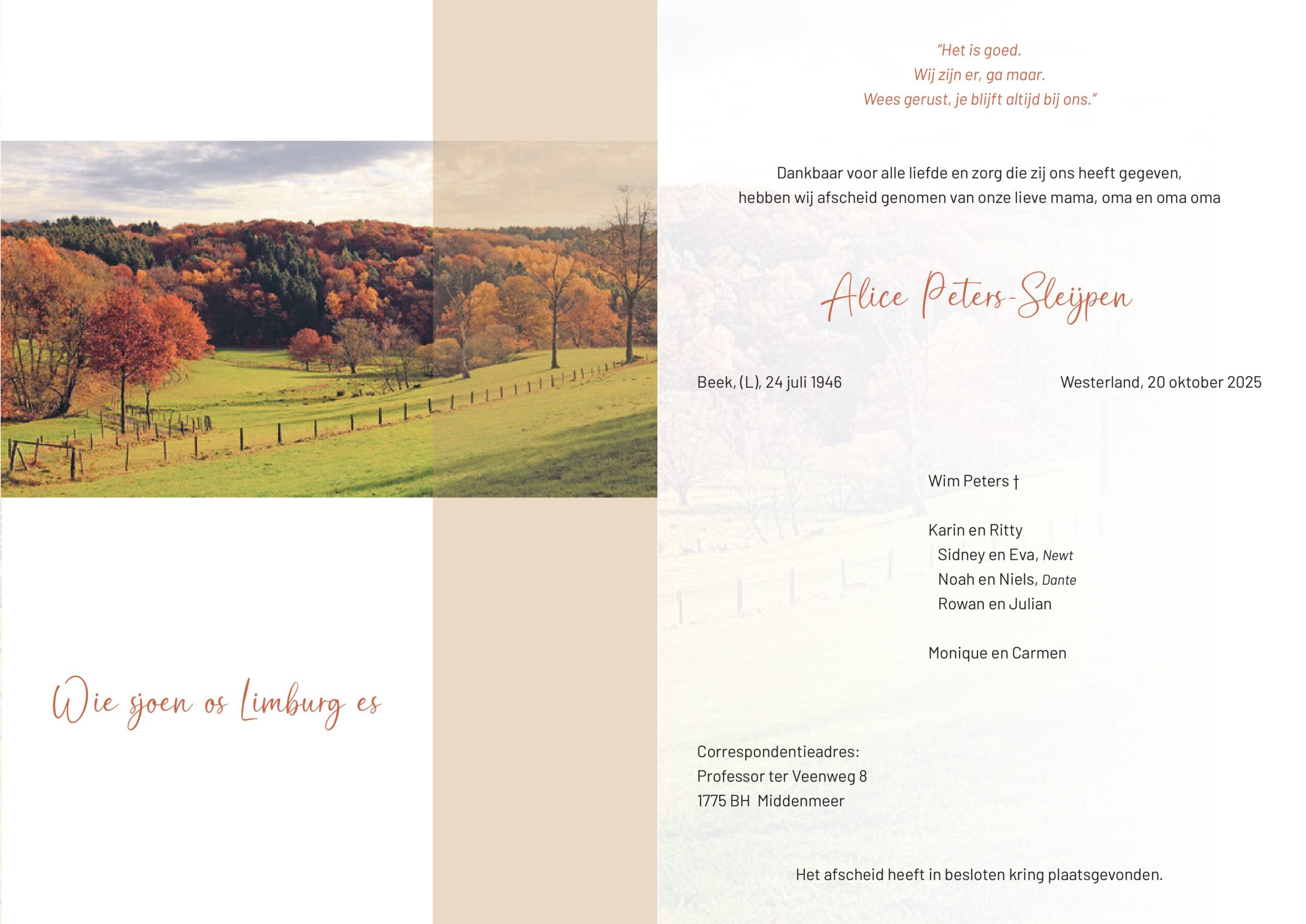 Home/Familieberichten/Overleden mevrouw Alice Peters-Sleijpen FamilieberichtenLokaal nieuwsNieuws Overleden mevrouw Alice Peters-Sleijpen De Meerpeen - Alexander Bügel24 oktober 2025 Dit delen:Tweet Klik om te delen op WhatsApp (Wordt in een nieuw venster geopend) WhatsApp Klik om dit te e-mailen naar een vriend (Wordt in een nieuw venster geopend) E-mail Klik om af te drukken (Wordt in een nieuw venster geopend) Print TagsAlice Peters-Sleijpen familieberichten overleden De Meerpeen - Alexander Bügel24 oktober 2025 Laat meer zien Delen Facebook X LinkedIn Tumblr Pinterest Messenger Messenger WhatsApp Telegram Deel via de e-mail Print