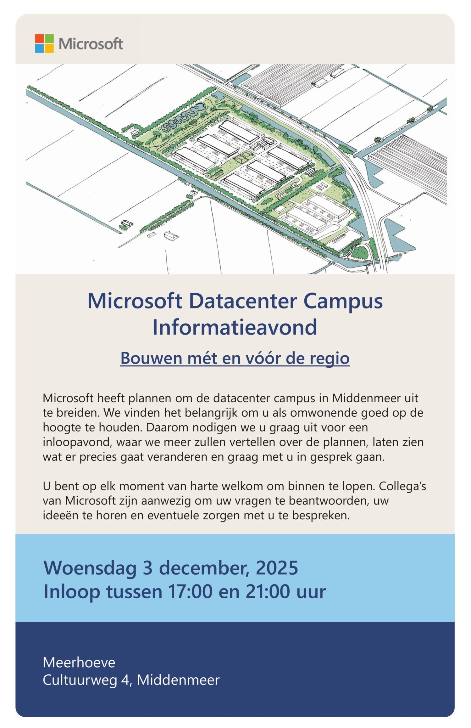 De bijeenkomst vindt plaats op woensdag 3 december 2025 bij de Meerhoeve aan de Cultuurweg 4 in Middenmeer. Bezoekers kunnen tussen 17.00 en 21.00 uur vrij binnenlopen. Medewerkers van Microsoft zijn aanwezig om uitleg te geven over de uitbreidingsplannen en in gesprek te gaan met geïnteresseerden.